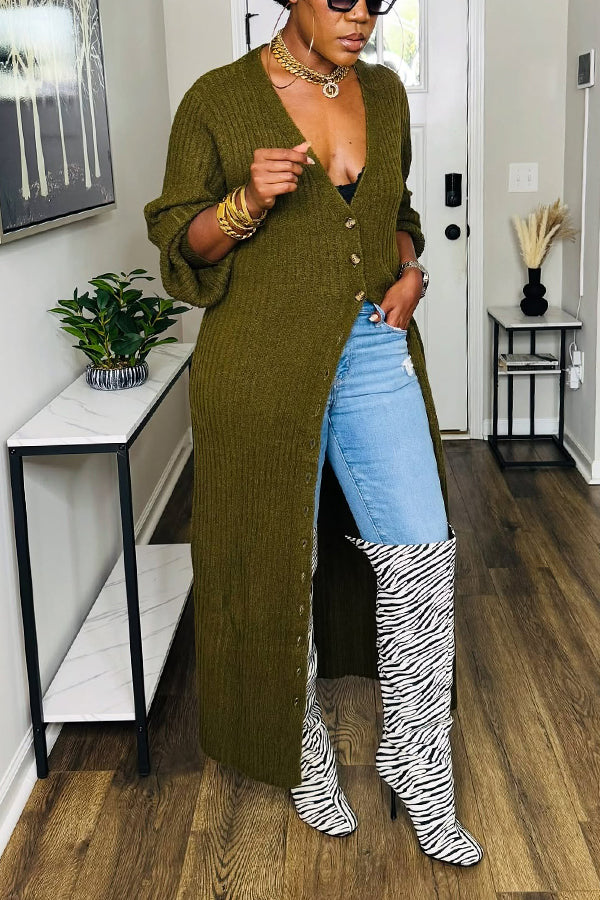 We're glad you've clicked on our new knitted cardigan as we're really into its chic vibes! The v neck and long sleeve cut make this a great choice for any stylish girl.