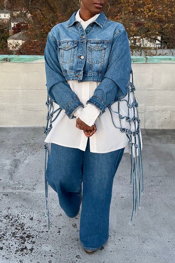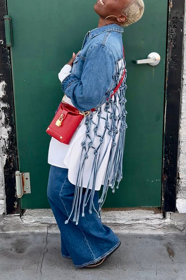 Stay on trend this season in our new stylish, lapel jacket. We especially love the distressed fabric and think this piece will be a new favorite in your closet!