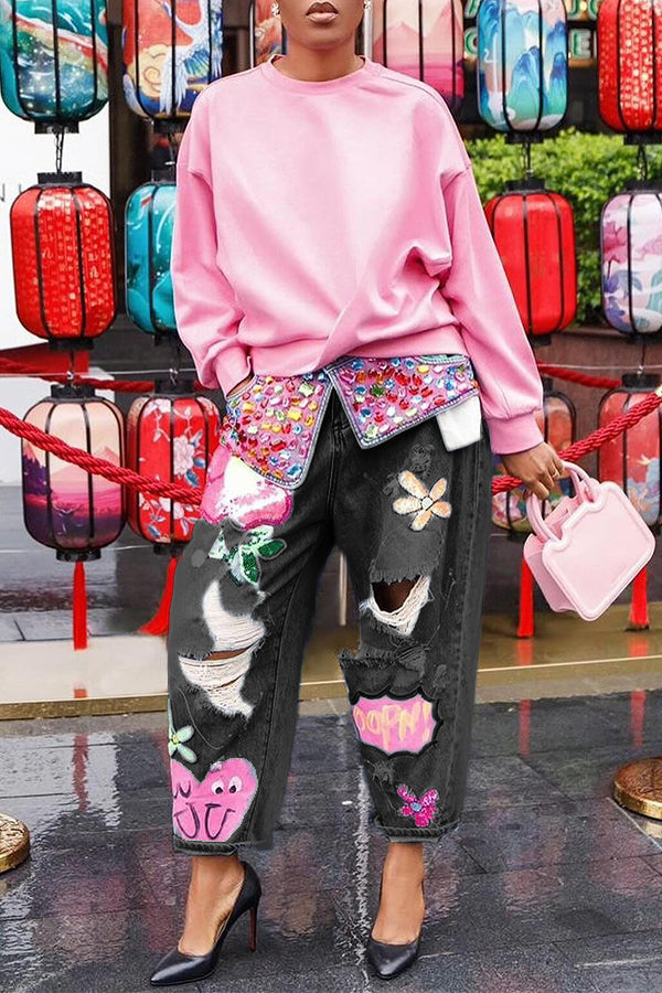 Casual Drop Shoulder Split Hem Sweatshirt Set