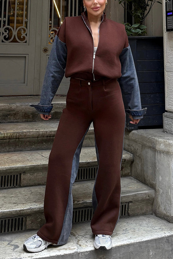 Stylish Denim Patchwork Jacket & High Waist Pants Set