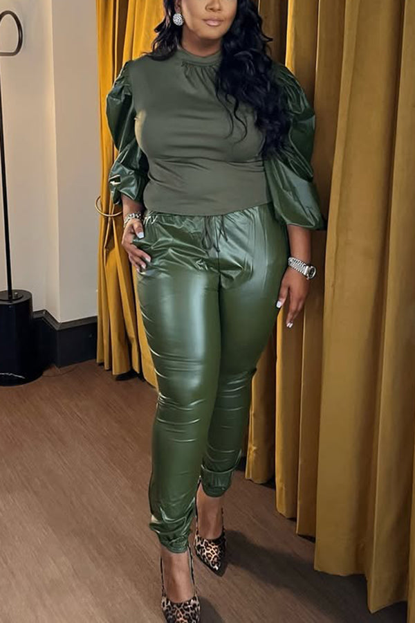 Fashion PU Gigot Sleeve Top & Pants Set