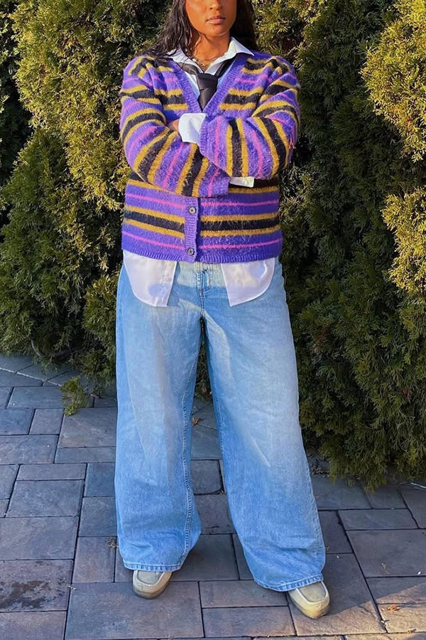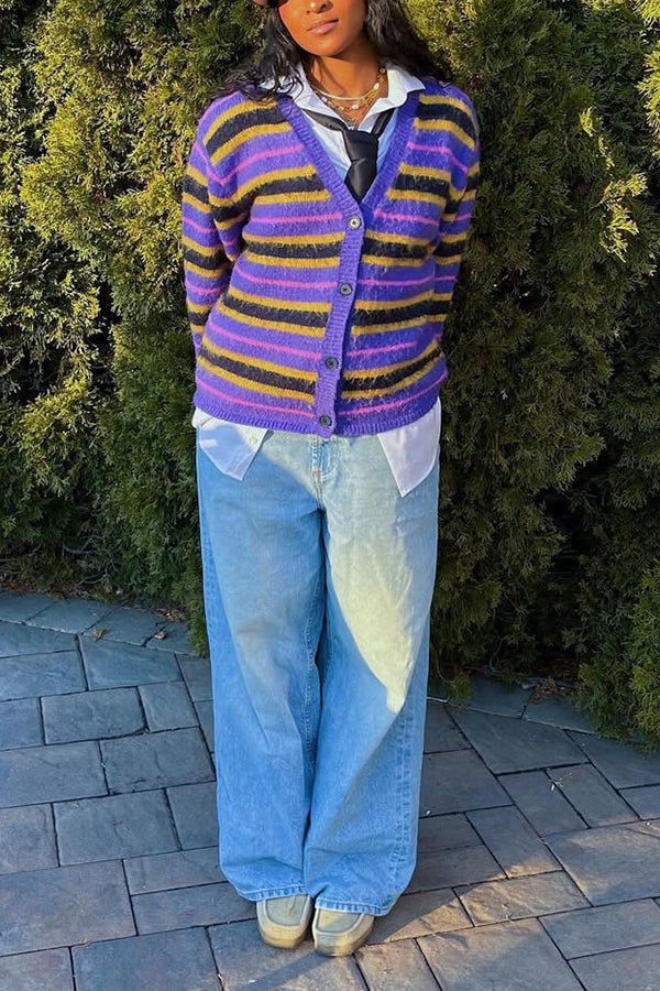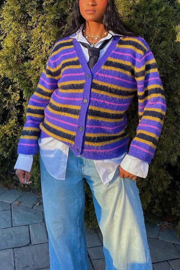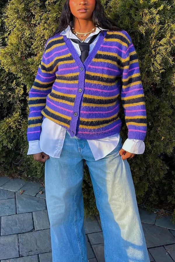 Stay on trend this season in our new stylish, v neck cardigan. We especially love the striped fabric and think this piece will be a new favorite in your closet!