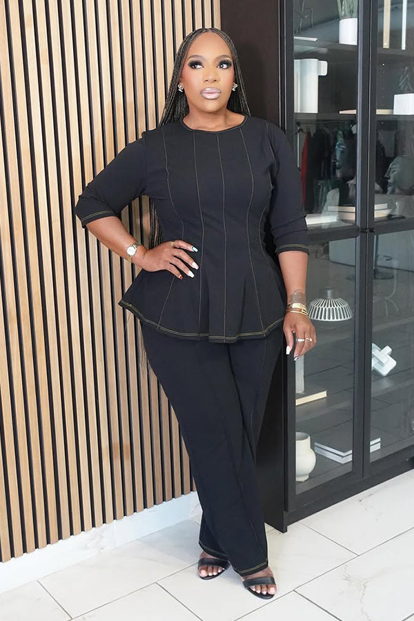 Command attention with tailored grace in this denim peplum set that defines modern sophistication. The structured top features contoured vertical seams that cinch the waist and flare at the hips for a flattering, hourglass silhouette.