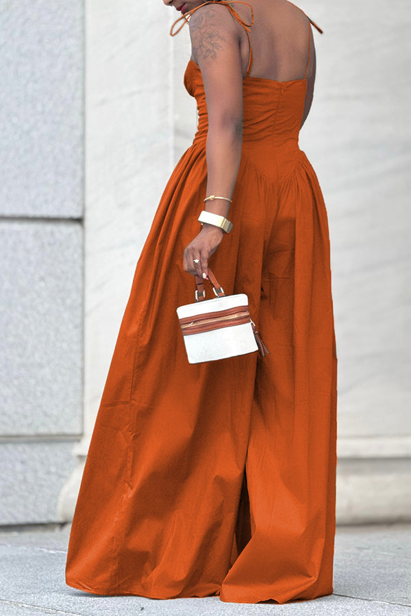 This wide-leg jumpsuit is giving major statement energy with minimal effort. Featuring a fitted bustier-style top with tie-up straps and dramatically voluminous legs, it blends structure with flow. The cinched waist enhances your shape, while the soft fabric keeps things comfortable.