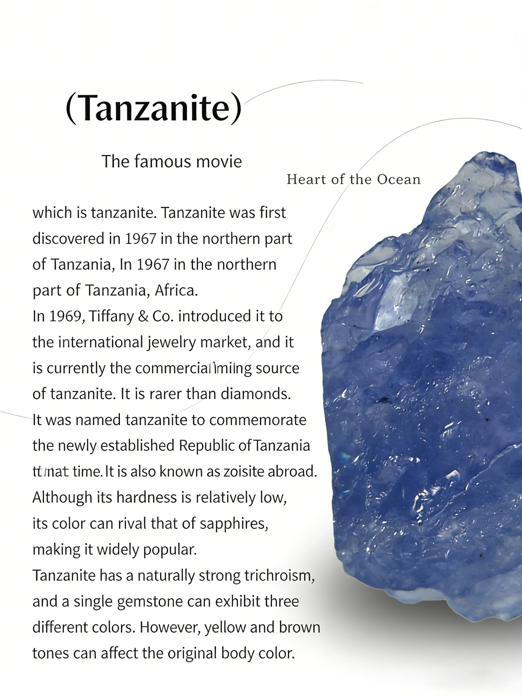 Tanzanite is hailed as the "gemstone miracle of the 20th century." Discovered only in 1967, it gained worldwide fame thanks to the deep blue "Heart of the Ocean" necklace (whose prototype was tanzanite) featured in the movie *Titanic*.