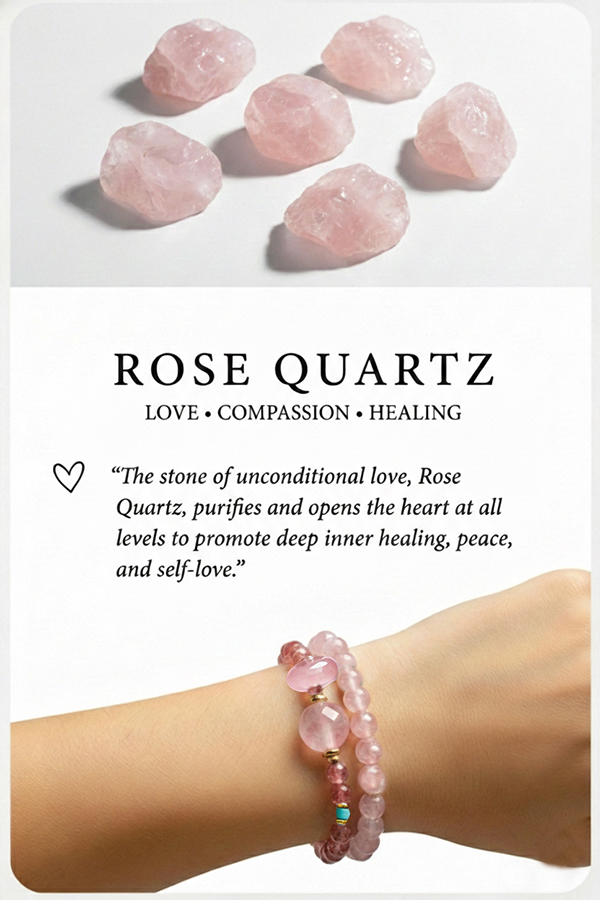 Rose quartz, known as the "stone of love," improves the wearer's aura, allowing you to radiate a gentle and captivating charm, thus attracting romantic relationships and love.