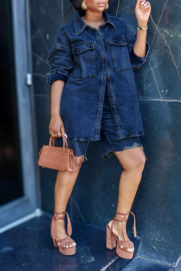 Sun's out☀?. Feel cool in our jean shorts, with a relaxed fit, a high rise waist, and longline design. Pairs perfectly with crop top and matching demin jacket for vacation days and festival weekends.