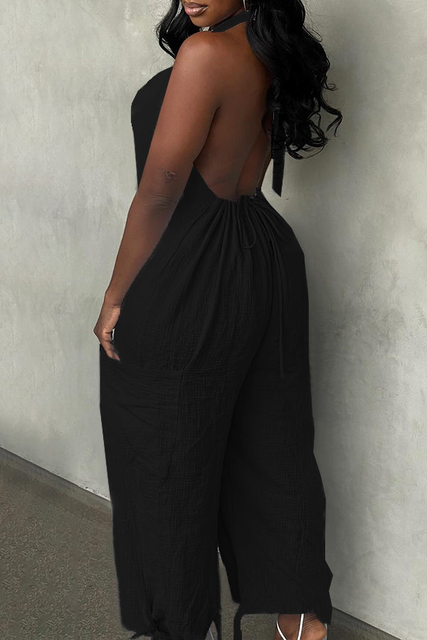 Embrace the effortless elegance of this Halter Drawstring Back Jumpsuit, perfect for welcoming the summer season with style. This jumpsuit features a drawstring back design and pockets for added style. Ideal for weekend wear, whether it's a family gathering or brunch outing.