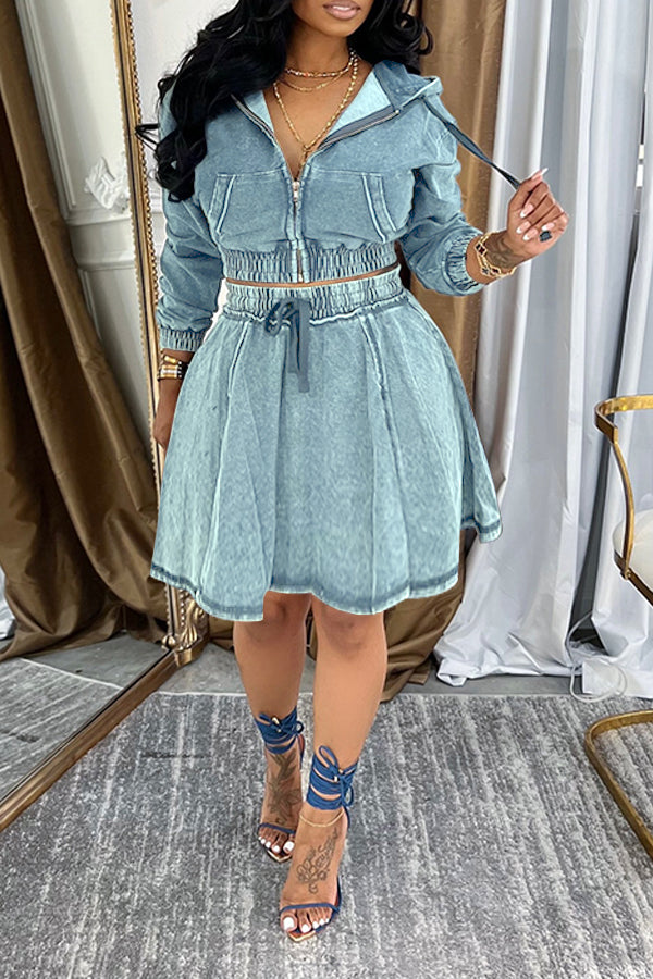 Model 5??2 wearing a size small? good stretch? elastic waist? 85% cotton? 11% polyester? 4% spandex cropped front zipper hooded jacket? drawstring waist skirt with under shorts?