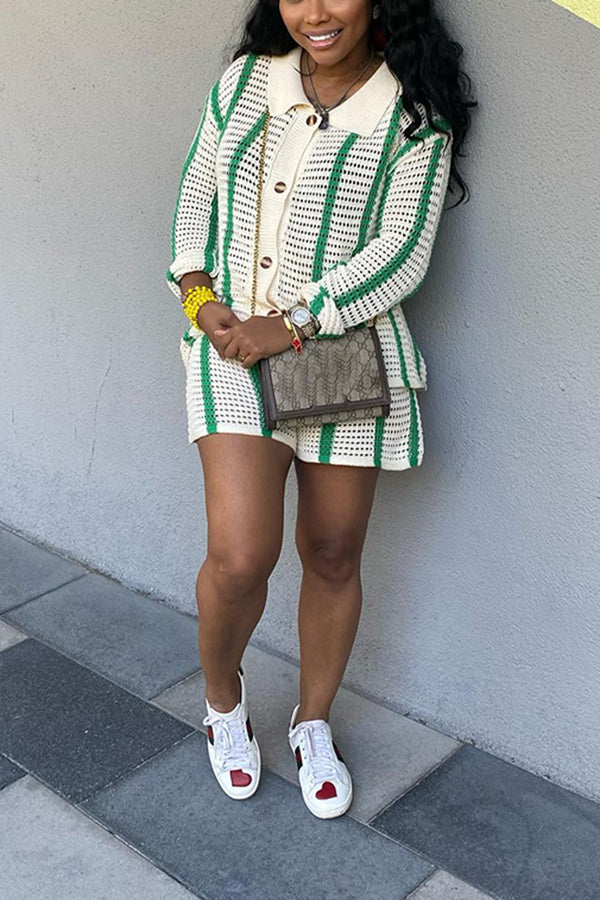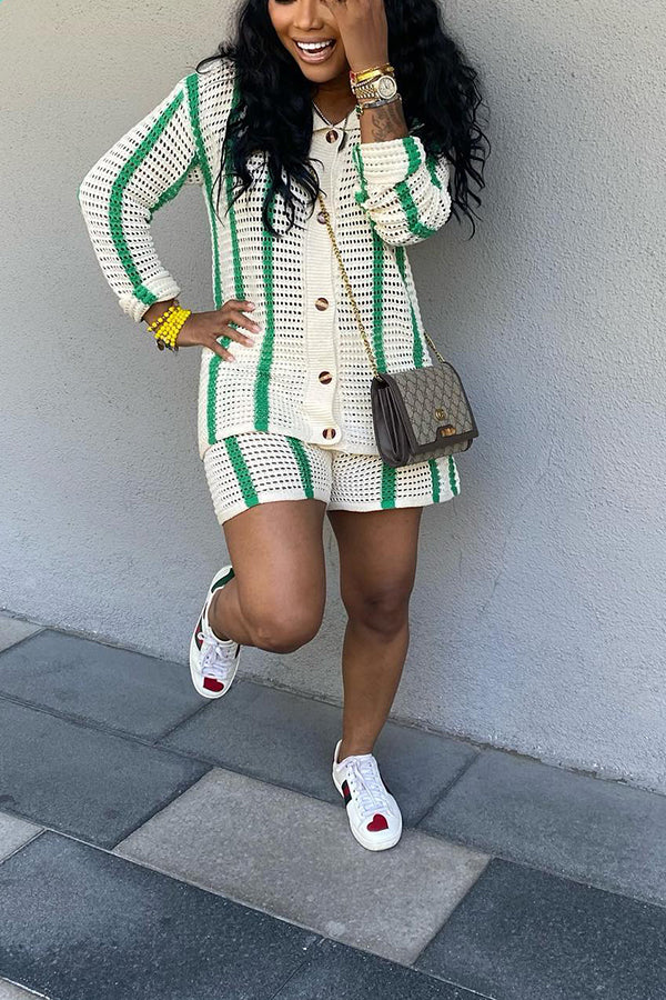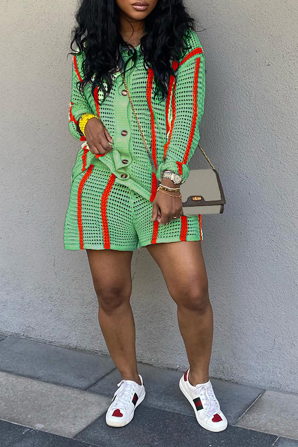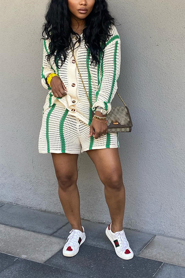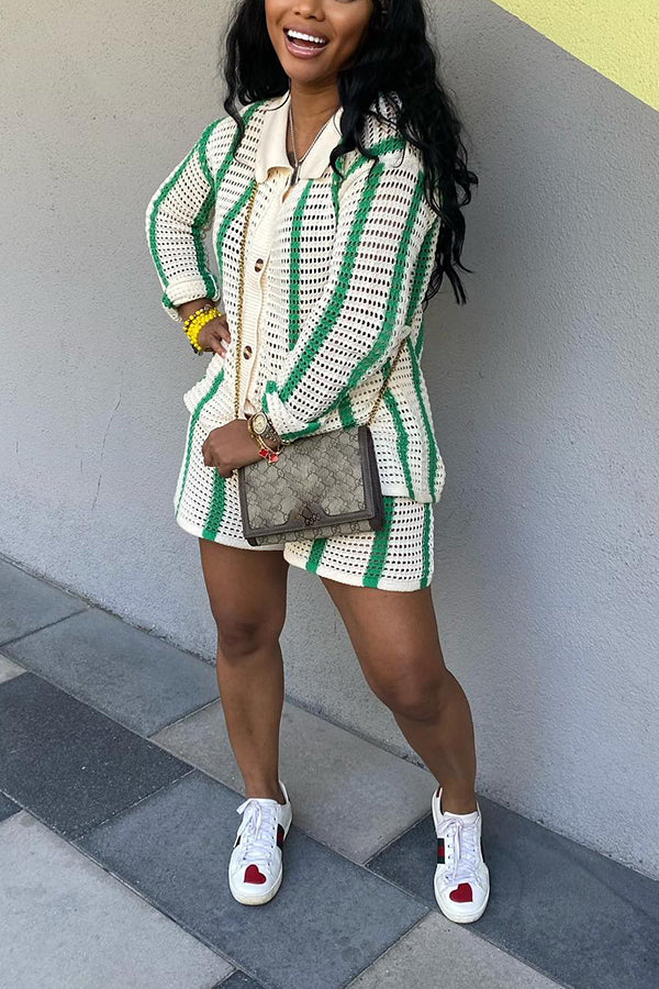 Are you ready to slay this summer in our strip?crochet short set. Featuring cute colored crochet shorts and oversized top with button closure and a classic collar. Wear this with some cute and comfy slides or your favorite nude heels.?Add this look to your wardrobe now!