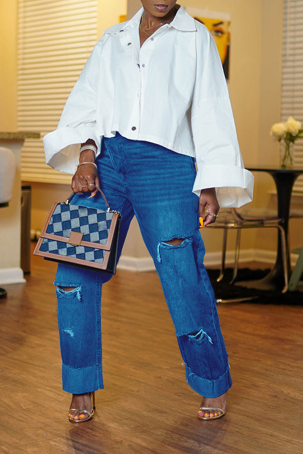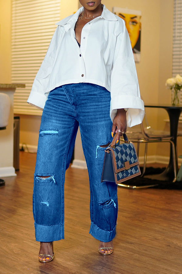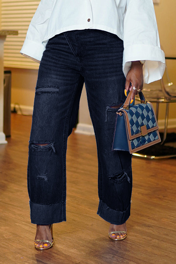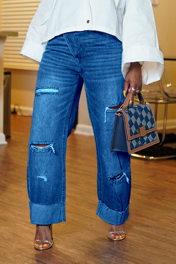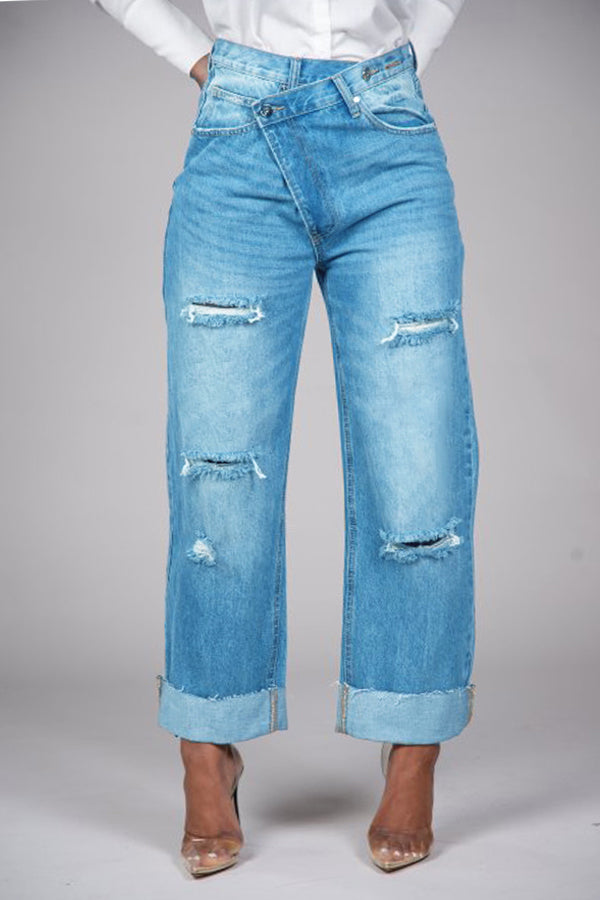 How unique is this pair of crossover button denim? This denim can easily be dressed up or down! Pair them with a blazer and heels or your favorite tee and sneakers. This denim has a button closure versus a zipper. The cuff can be adjusted to your liking or worn as is. The rips/tears are just enough to give the denim a little personality.